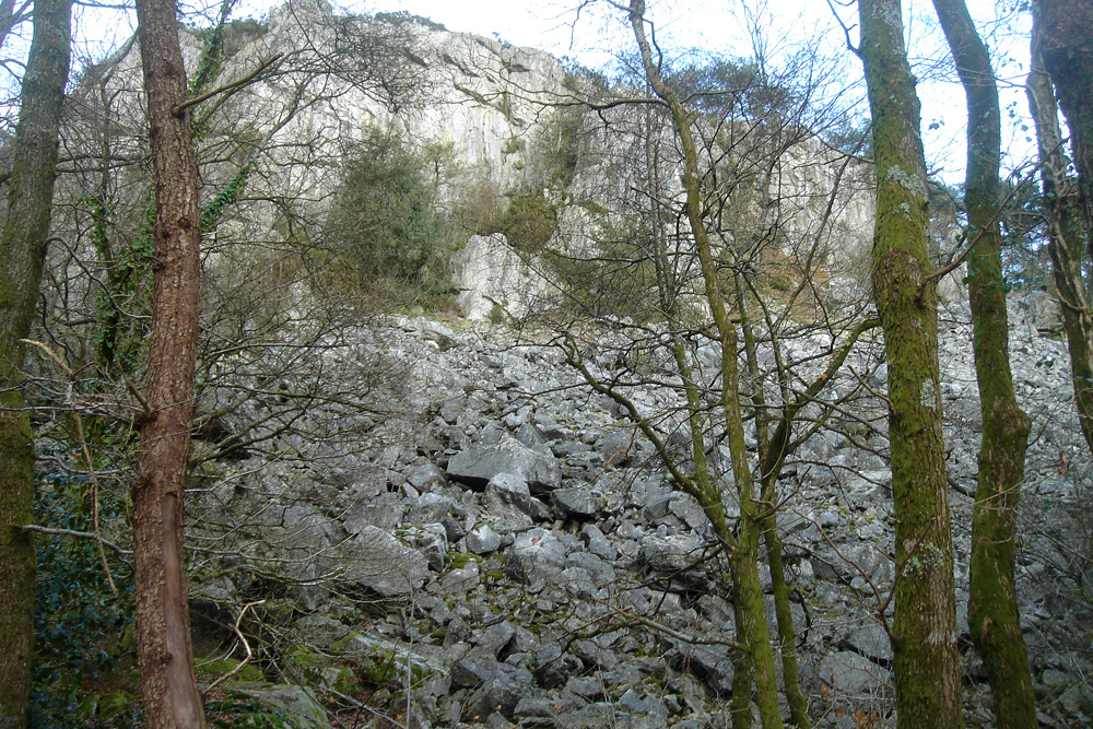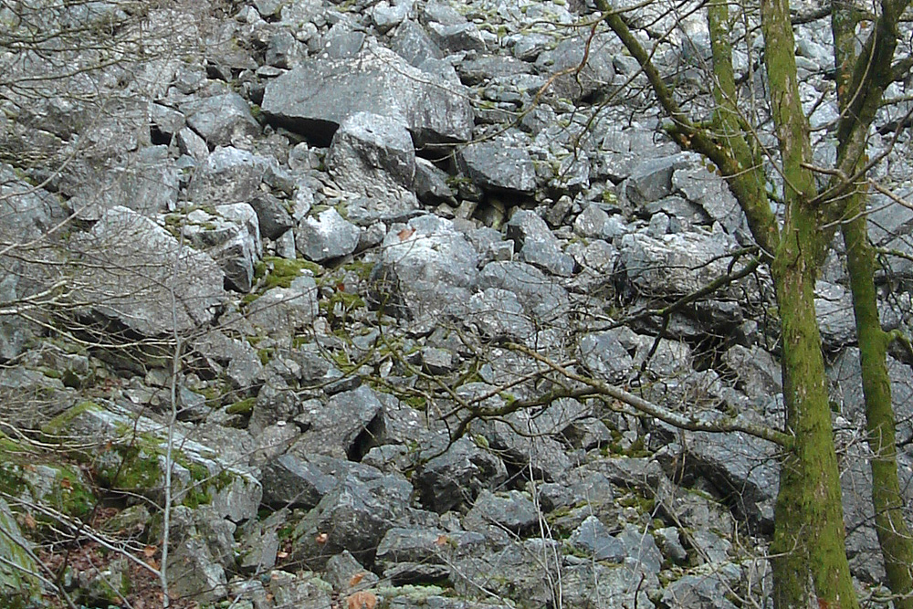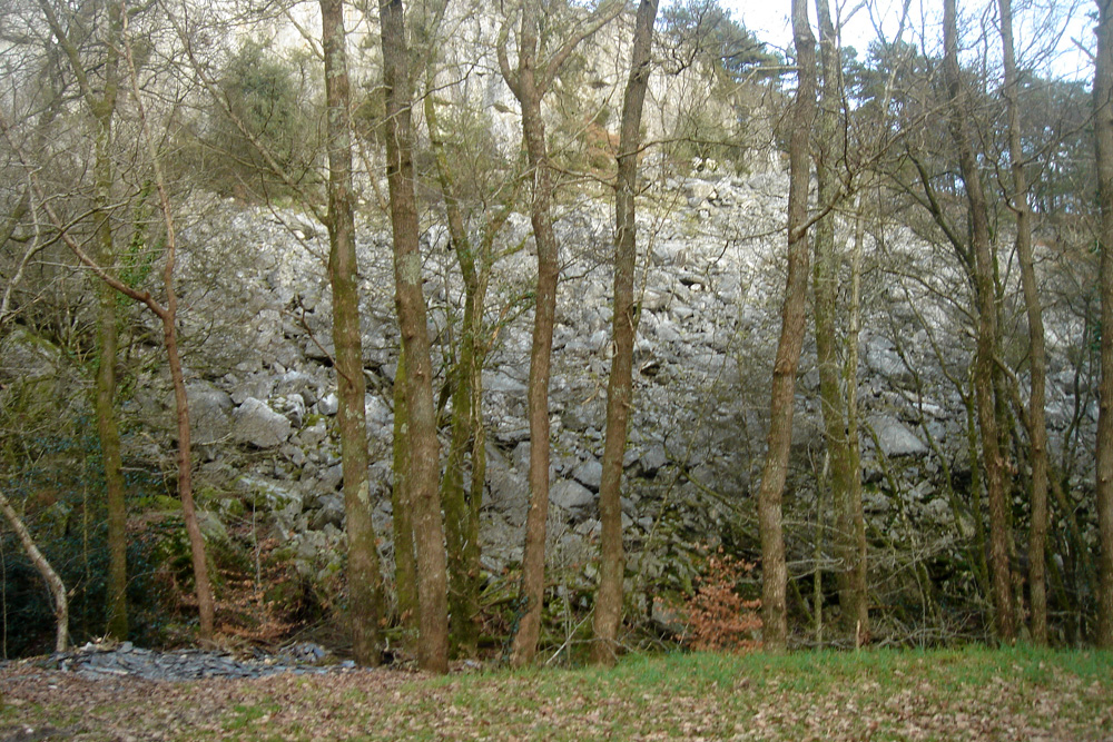On accède à l’éboulis par un chemin partant de la route D487. La vue est partiellement masquée par de grands arbres ; l’éboulis n’est pas praticable. |