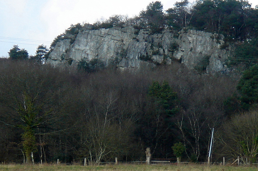 Cette barre qui alimente l’éboulis culmine à la cote 318 m ; elle est constituée de bancs de Grès armoricain à pendage 15°N. L’éboulis, situé au pied de la barre, est masqué par les arbres. Vue prise depuis la route D487 |