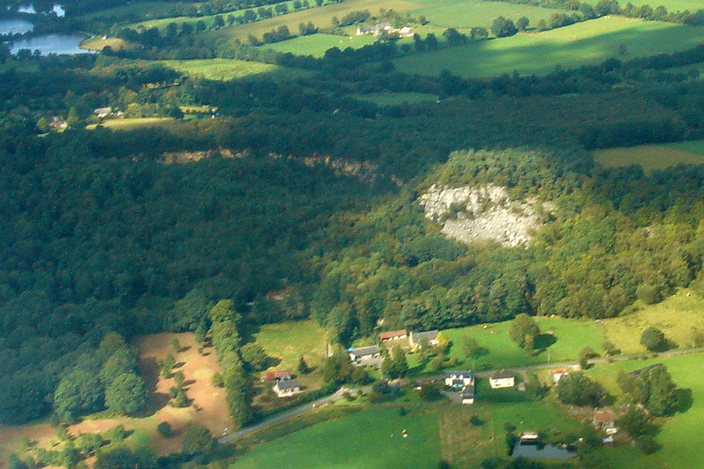 Au NE de la barre rocheuse, le Grès armoricain affleure aussi au sommet du front de taille d’une ancienne carrière envahie par la végétation (à gauche sur la photo). Photo prise vers le NW |