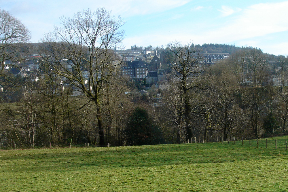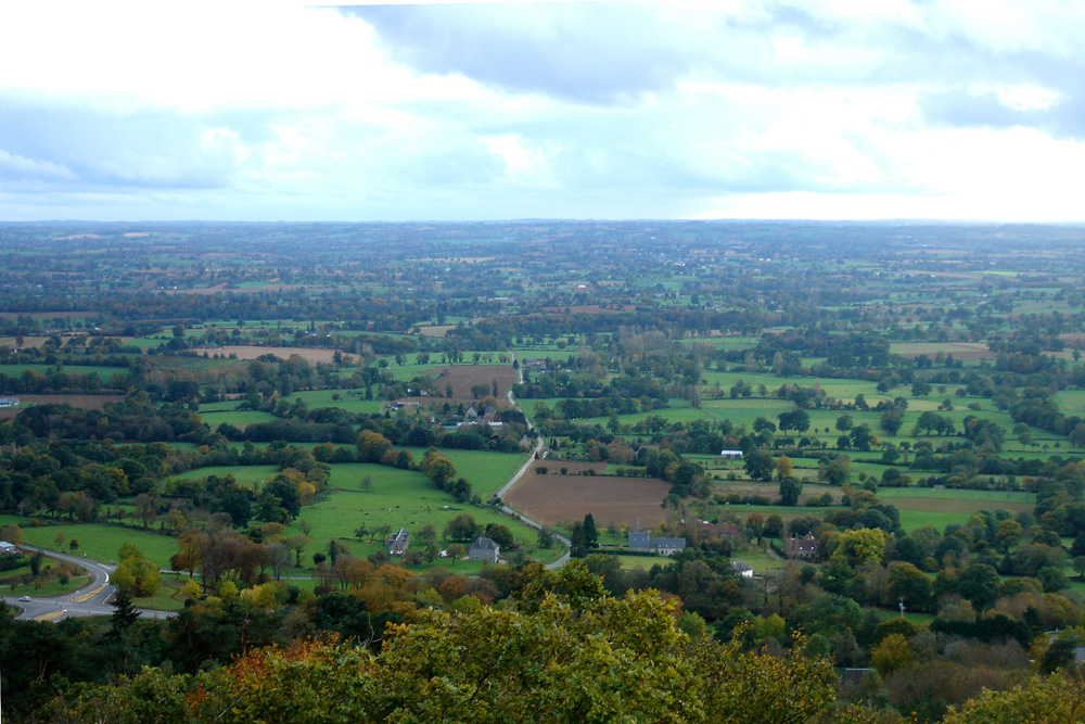 La crête boisée (à l’horizon sur la photo) qui domine la ville de Mortain est constituée par le Grès armoricain des Rochers de la Montjoie et de la Petite chapelle.