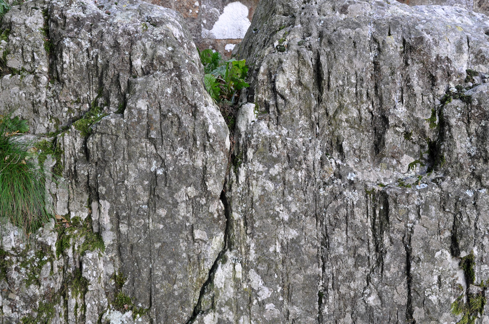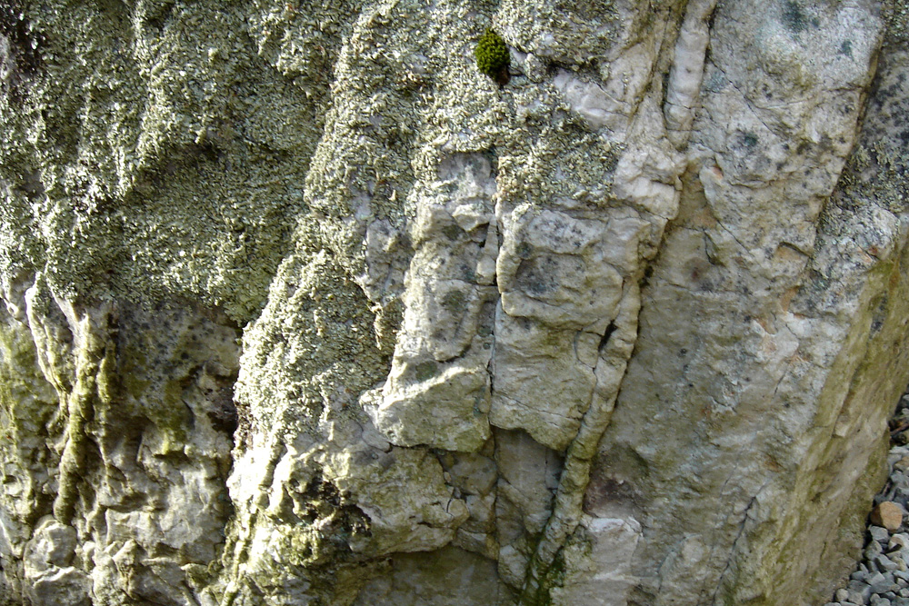 Au pied de la chapelle, ce banc disloqué présente le faciès caractéristique à Skolithos du Grès armoricain. |