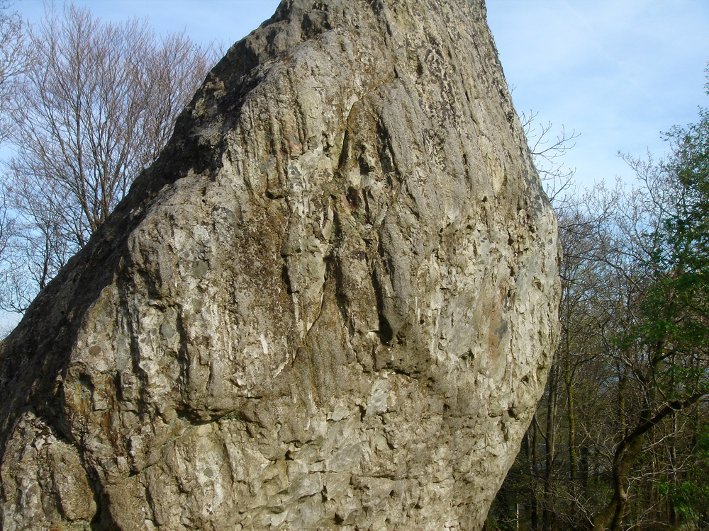La fracturation rend la lecture de la stratification difficile. Le socle de la statue est en granodiorite cadomienne. L’accès au Rocher s’effectue par la D246 à l’arrière de l’Abbaye Blanche.