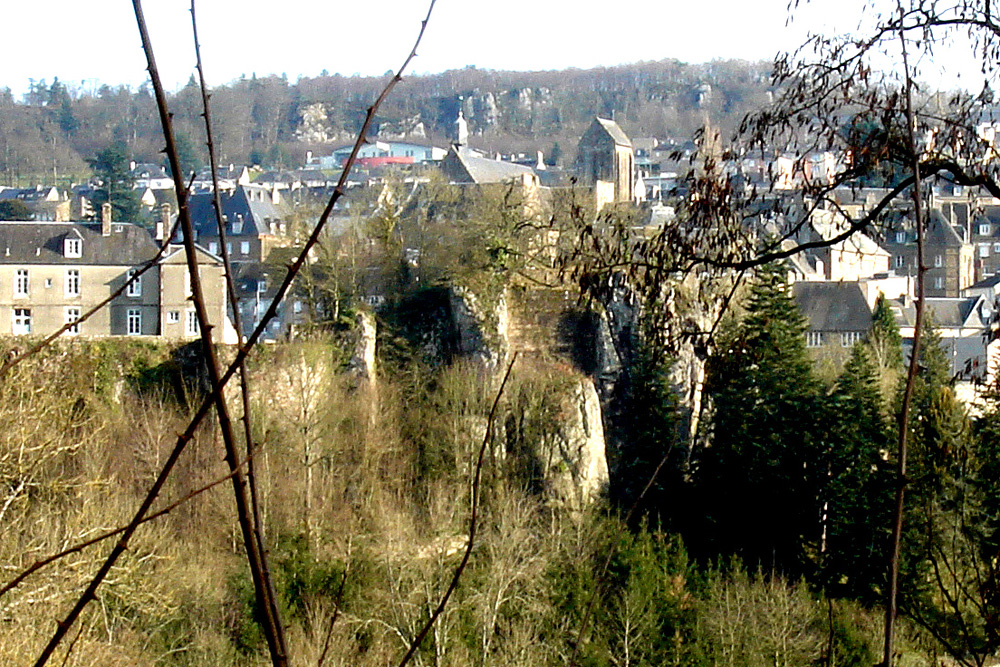 La ville de Mortain est dominée à l’Est par les Rochers de la Montjoie, visibles en arrière-plan sur la photo ; cette crête rocheuse d’orientation NS est située dans le prolongement nord du site de la Petite Chapelle. Au premier plan, sous le château, s’étend la barre de grès du chemin de la petite cascade, en partie masquée par les arbres.