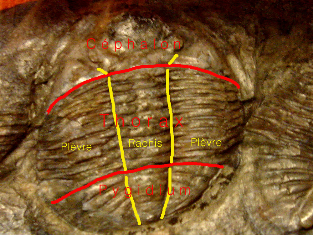 Un trilobite est un arthropode dont le corps est divisé en trois lobes longitudinaux et en trois parties d’avant en arrière : le céphalon qui porte les yeux, lle thorax qui porte les pattes et les branchies et le pygidium. Thorax et pygidium sont eux-mêmes divisés en segments.