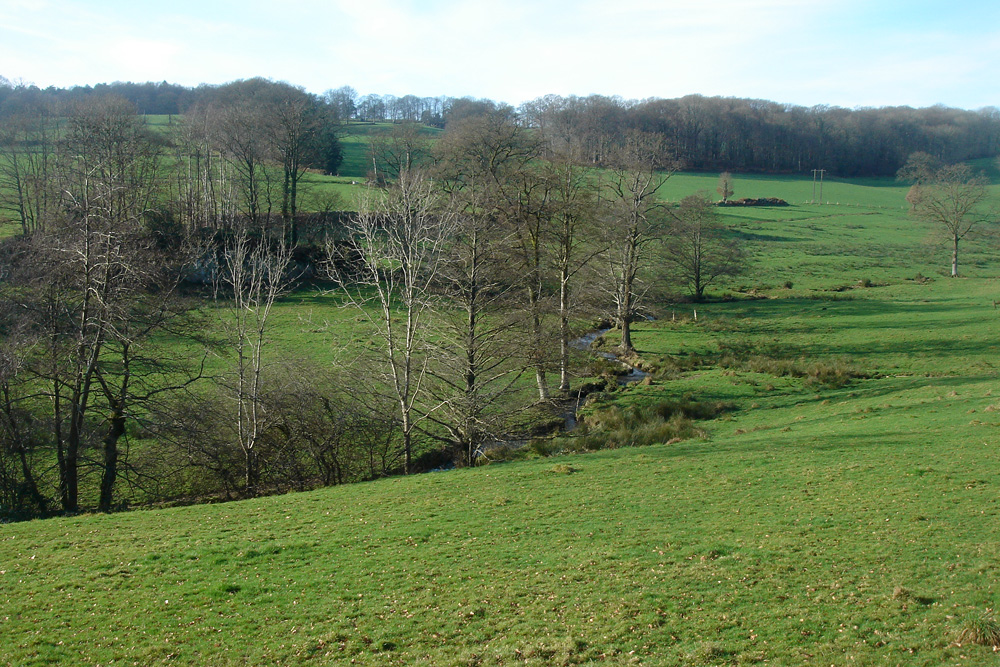 Le Cançon a creusé dans les siltites tendres de la formation des Schistes du Pissot une vallée largement ouverte, aux versants en pente douce. La zone boisée située à droite en arrière-plan correspond à la barre rocheuse de Grès armoricain de Roche Grise.