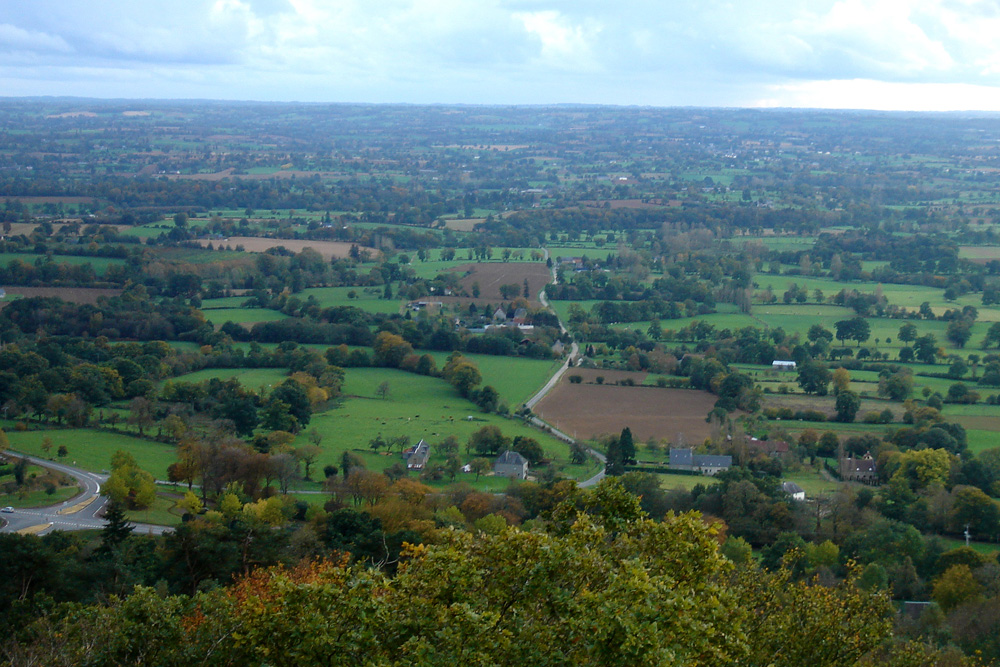 Au sud de Mortain, la zone déprimée qui s’étend au pied de la barre de Grès armoricain est constituée par les terrains briovériens, métamorphisés en cornéennes puis en schistes tachetés jusqu’à 2,5 km de distance. |