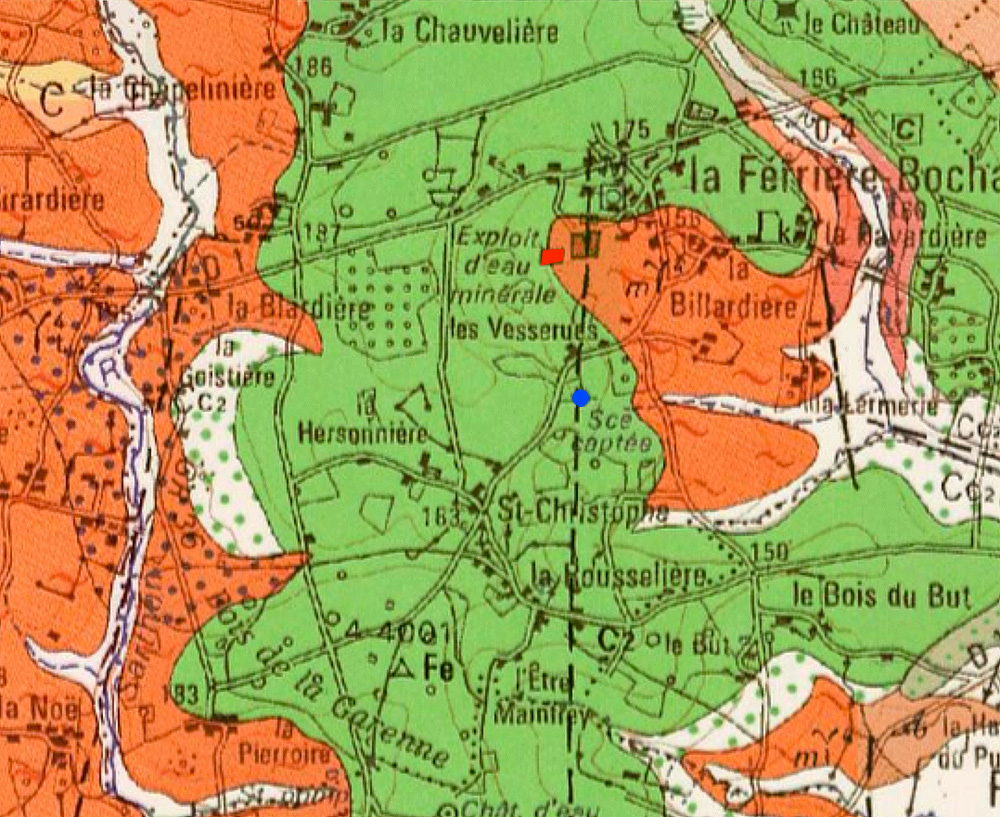 Les Sables du Maine (C2), représentés en vert, recouvrent la granodiorite cadomienne de Saint-Pierre-des-Nids (en rouge sur la carte). L’usine Roxane est construite sur la limite d’affleurement des sables. L’eau exploitée est captée à la base des sables. |