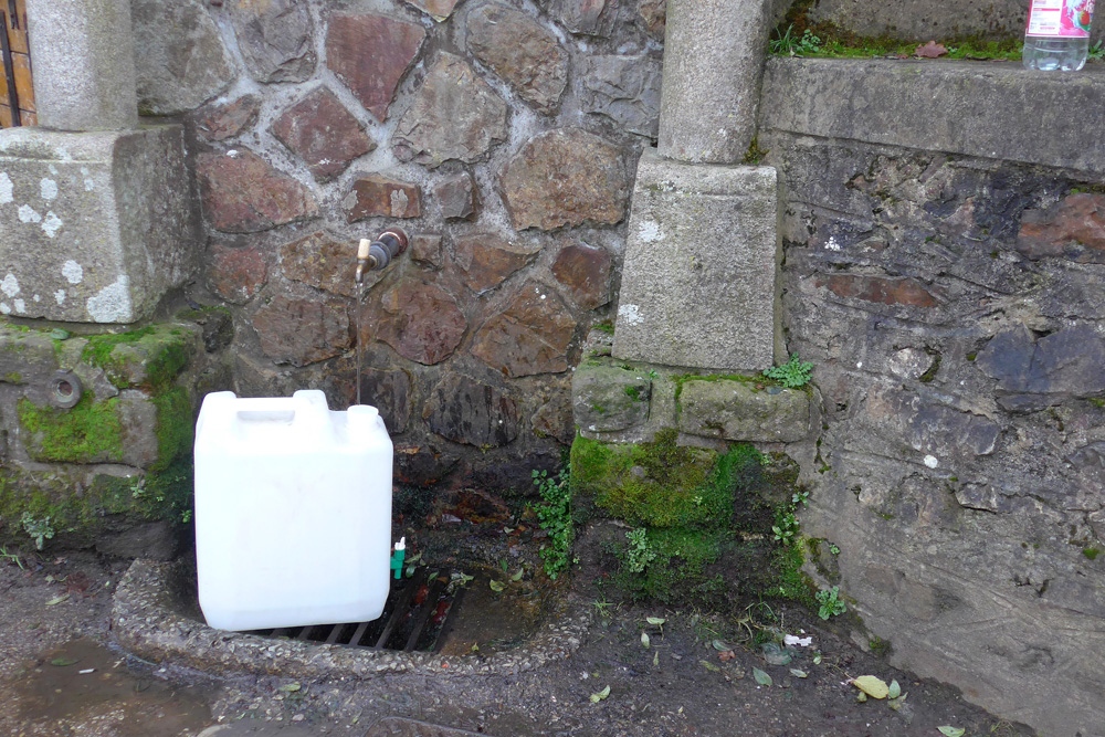 Le tuyau amène l’eau captée à une fontaine adossée à la paroi rocheuse. |
