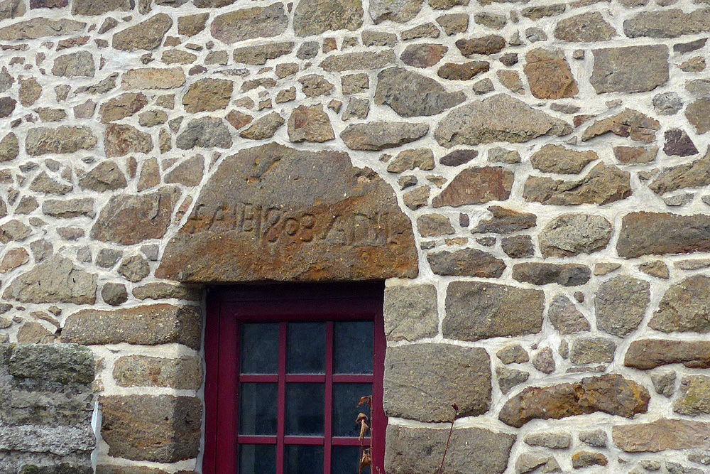 Linteau en grès roussard, grossièrement taillé et portant la date de construction de la maison (1808). Hameau de Saint-Laurent |
