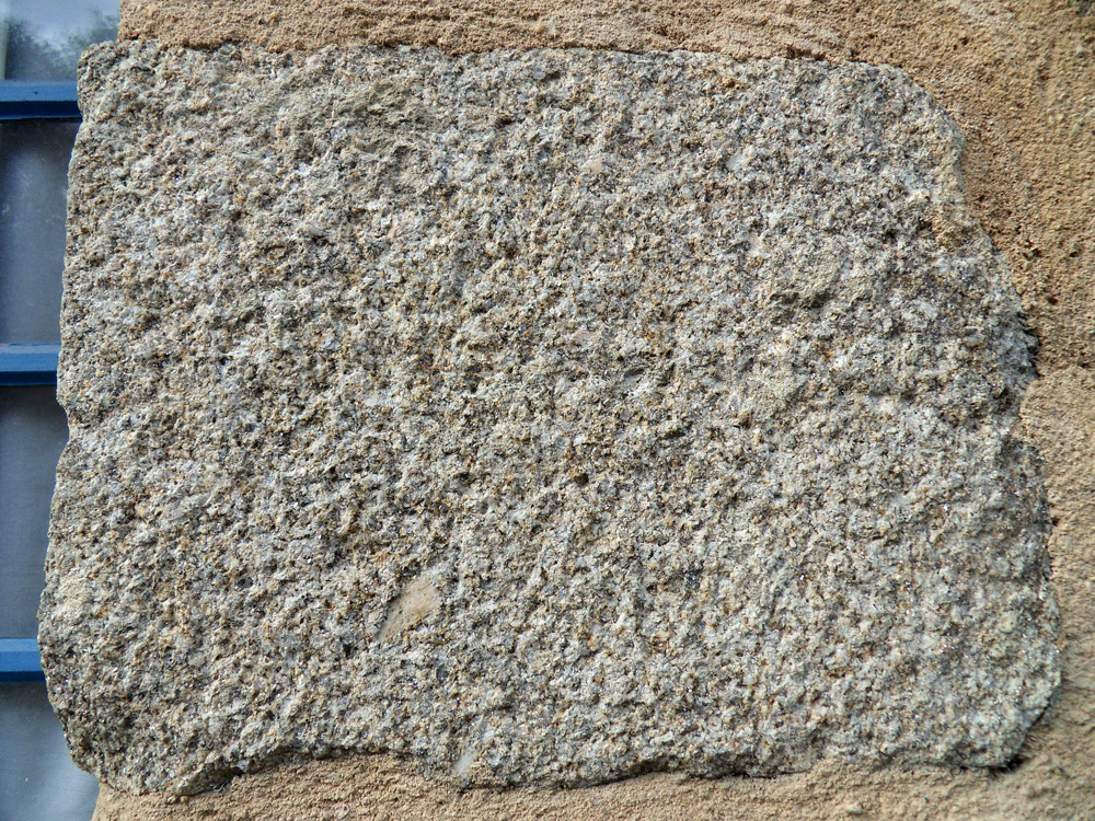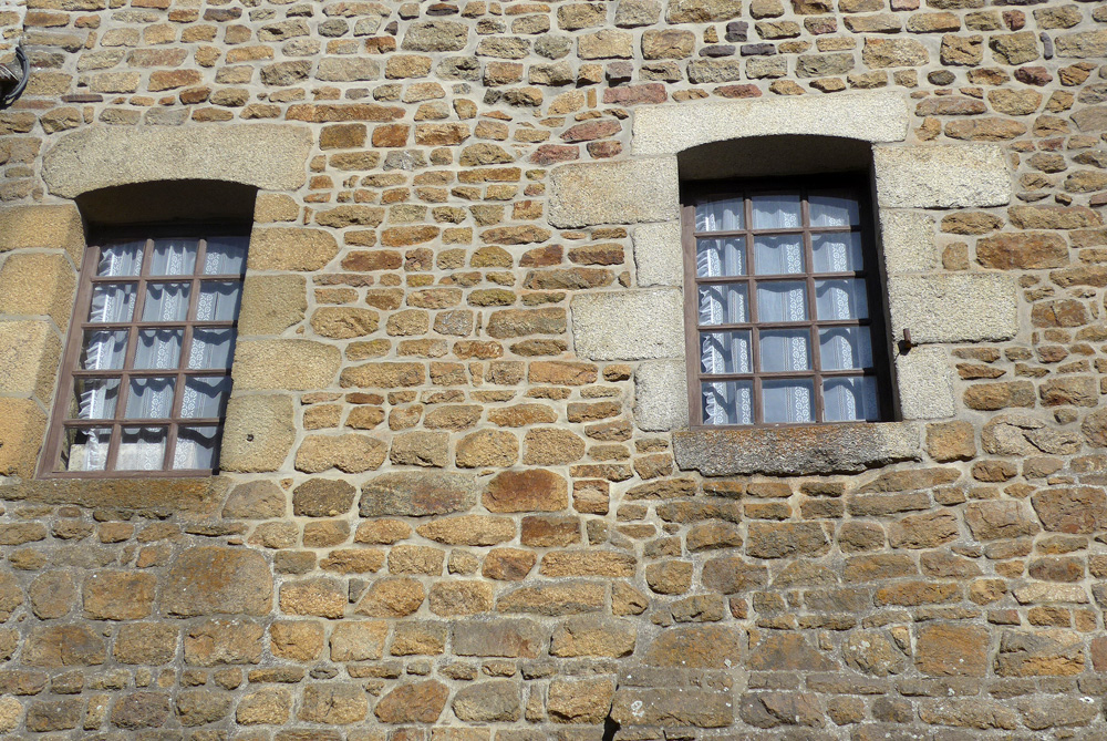 La façade de cette maison de bourg est construite majoritairement en granodiorite. La surface des moellons peut prendre une teinte légèrement rousse par altération. L’entourage de la fenêtre de droite est en leucogranite d’Alençon, plus clair que la granodiorite.