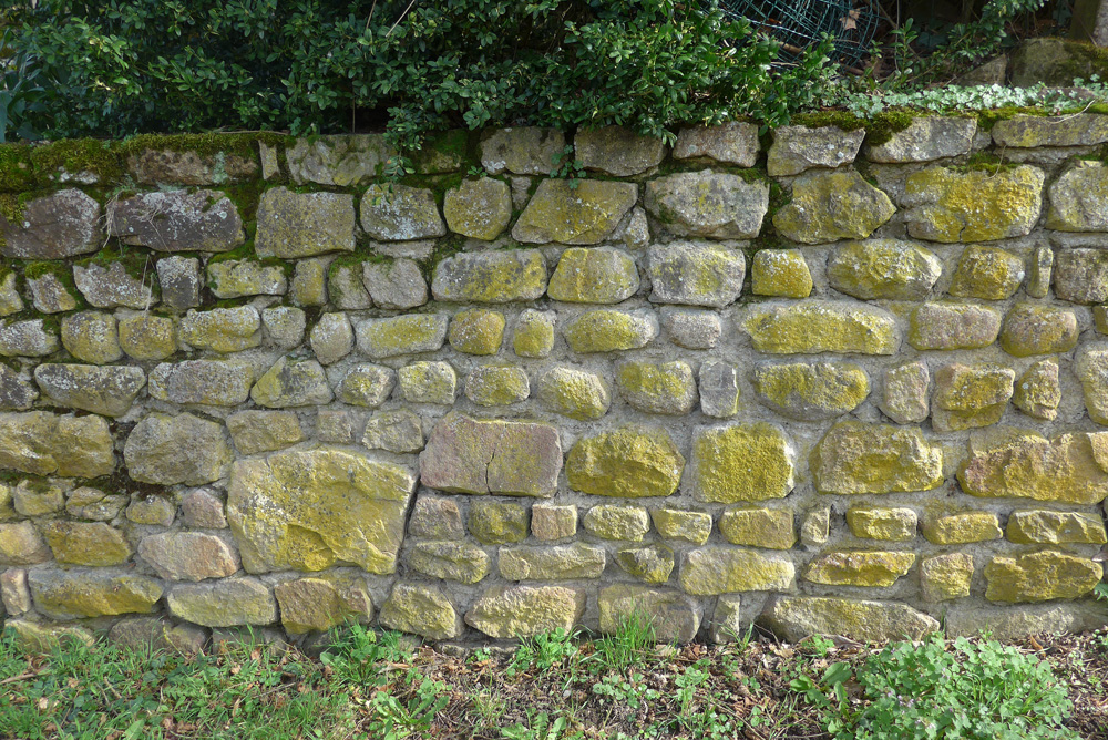 Les tons brun jaune des murs sont liés à l’utilisation du grès roussard ainsi que de mortier à base de sable local (Sables du Maine). |