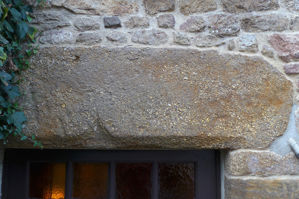 Dans l’entourage de la porte, de la granodiorite gris clair et beige s’intercale entre les blocs de grès roussard. Le linteau en grès roussard présente des zones de couleur rouille attestant la richesse en oxyde de fer de ce matériau. |