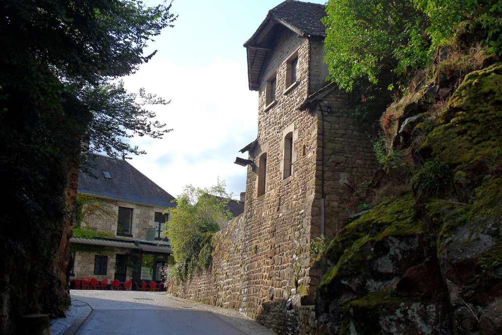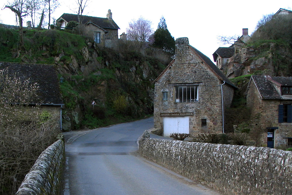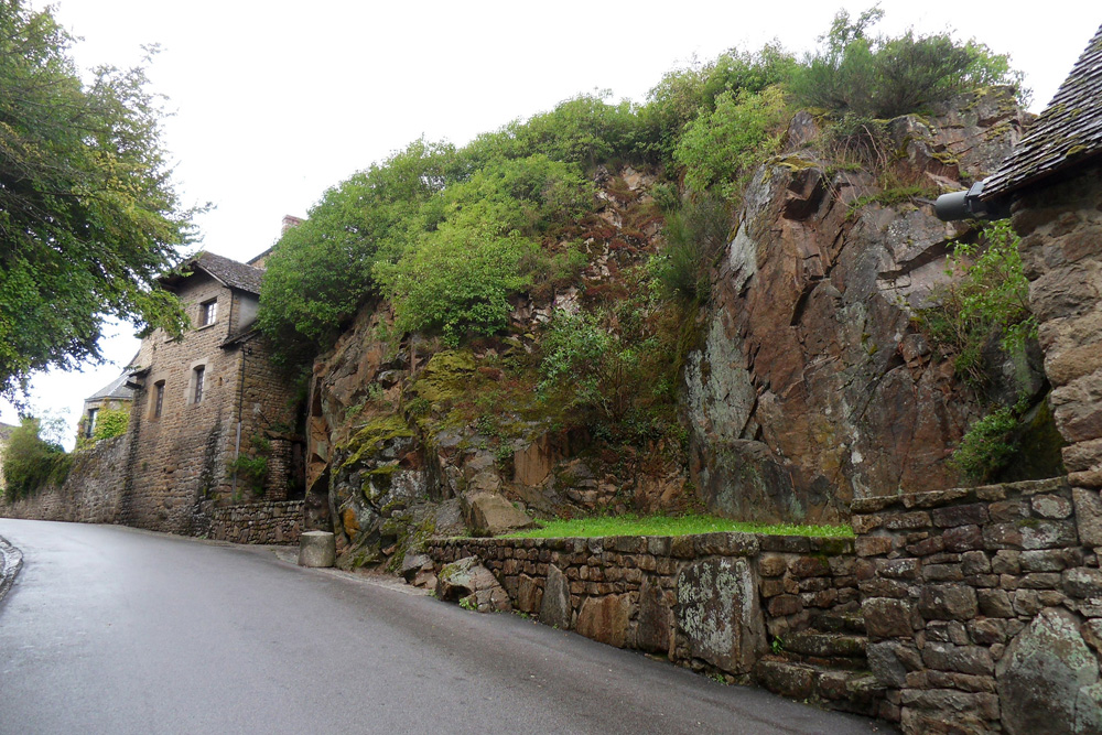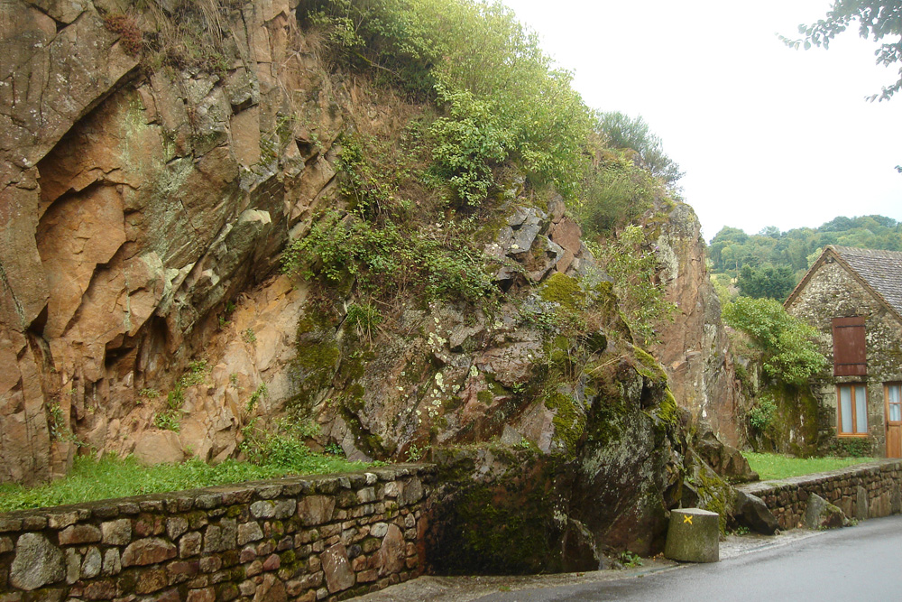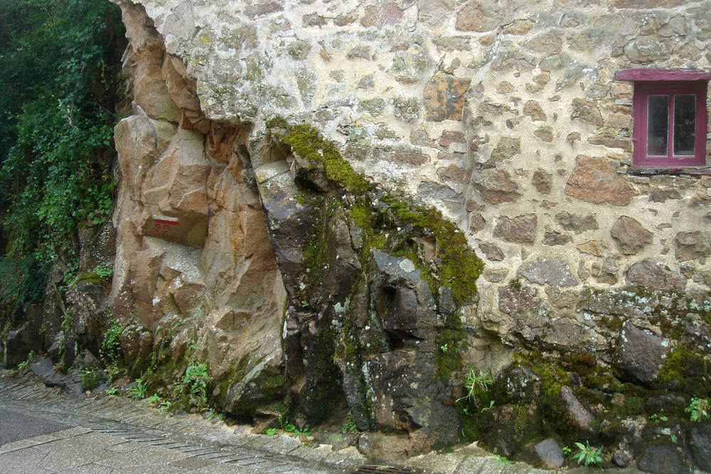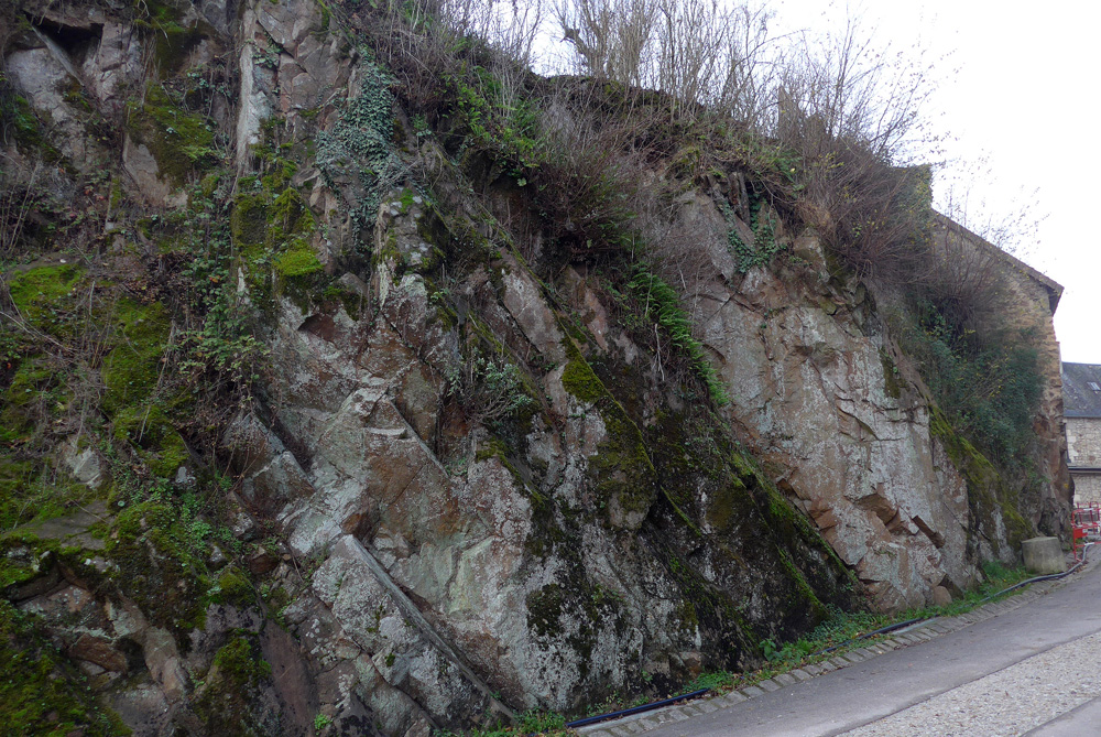 La granodiorite affleure de part et d’autre de la rue qui remonte l’escarpement de la rive droite de la Sarthe depuis le pont jusqu’à la partie haute du village.