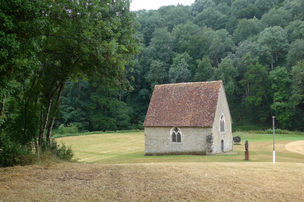 La chapelle Saint-Céneri, qui abrite le bloc de granodiorite, est construite à l’intérieur du méandre de la Sarthe,