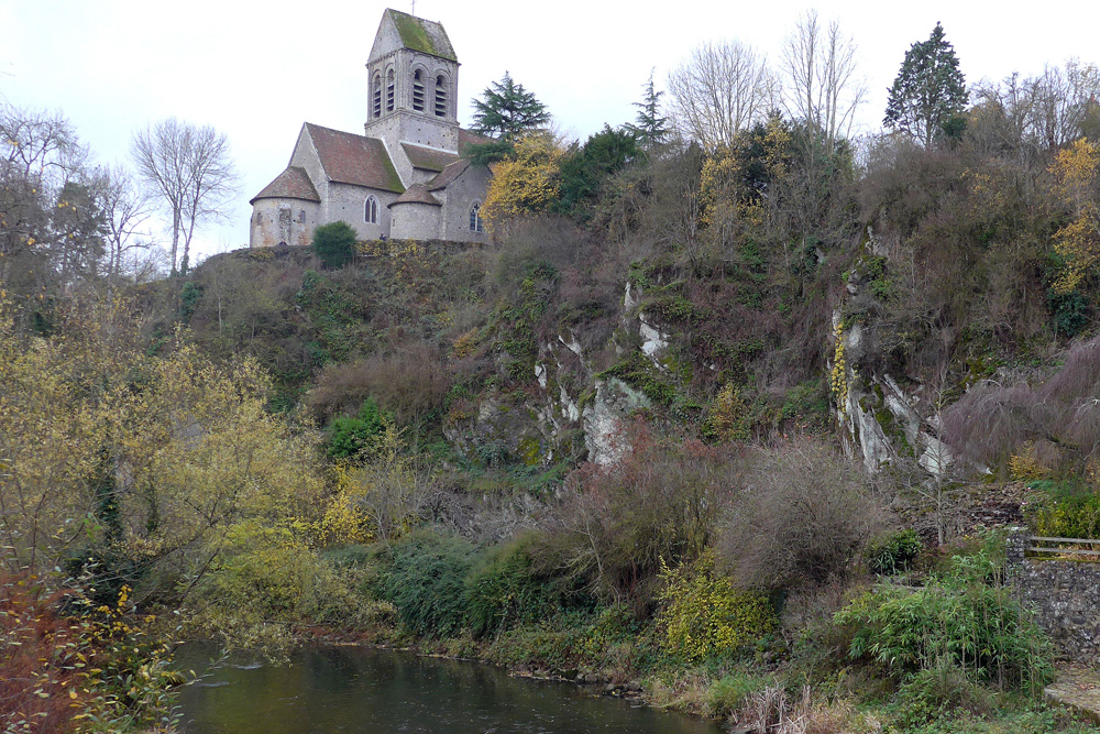 L’église de Saint-Céneri est bâtie sur un tertre de granodiorite, au sommet de la rive droite de la Sarthe.
