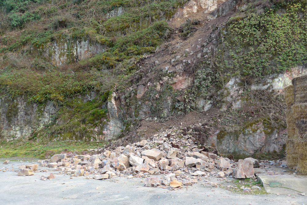 Dans le versant, on peut observer la zone d’arrachement d’où sont partis les blocs éboulés ; la roche à nu, très fracturée, présente une cassure fraîche de couleur claire. |