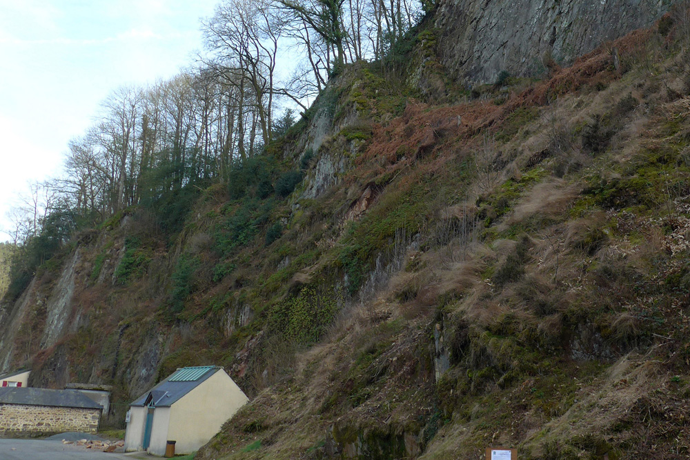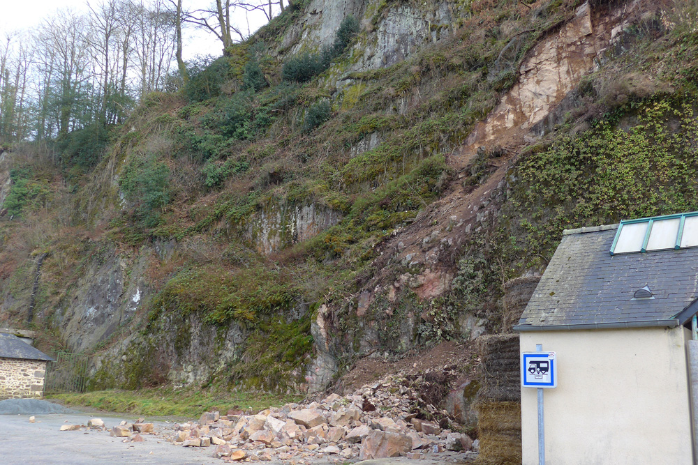 La zone d’arrachement de l’éboulement se situe à mi-hauteur de l’escarpement constitué de bancs de Grès armoricain verticaux qui dominent la partie ouest du parking le long de la route D 112.