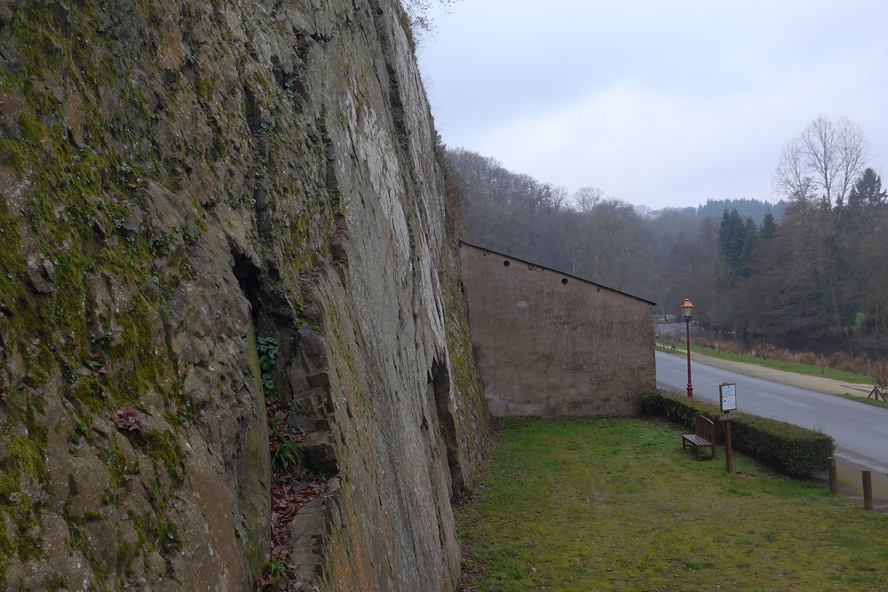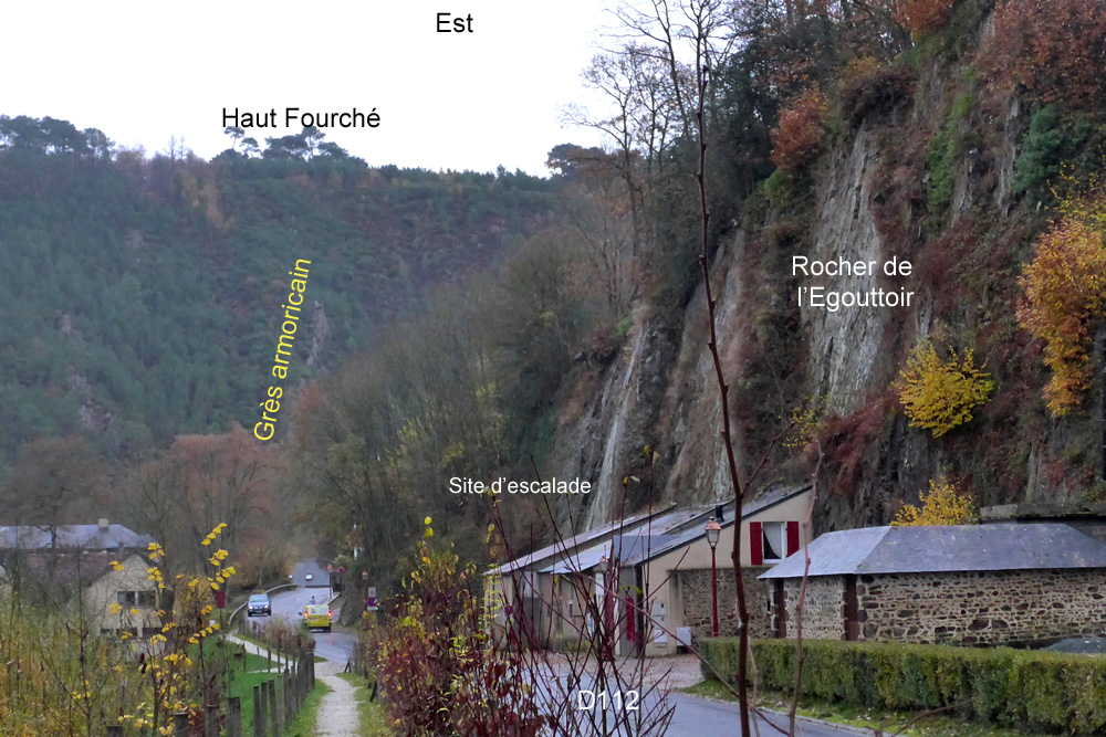 Les bancs de Grès armoricain redressés du rocher de l’Egouttoir, qui appartiennent au flanc sud du synclinal de Saint-Léonard-des-Bois, se prolongent avec le même pendage en rive gauche de la Sarthe, dans le versant qui culmine au Haut Fourché.