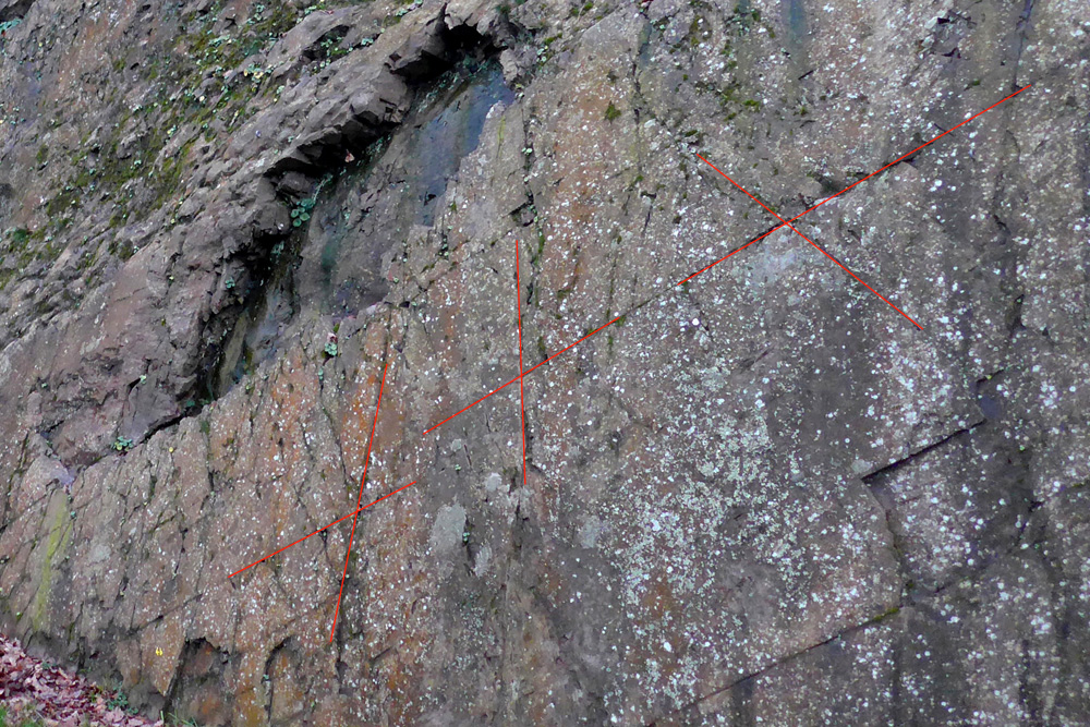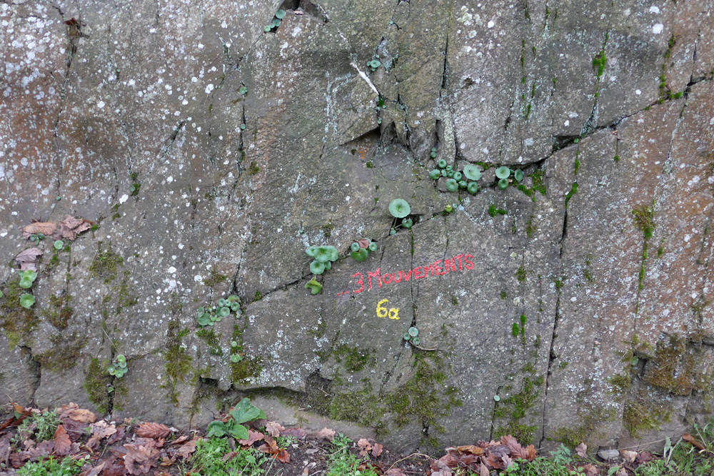 Départ de voies d’escalade qui exploitent les fractures du Grès armoricain