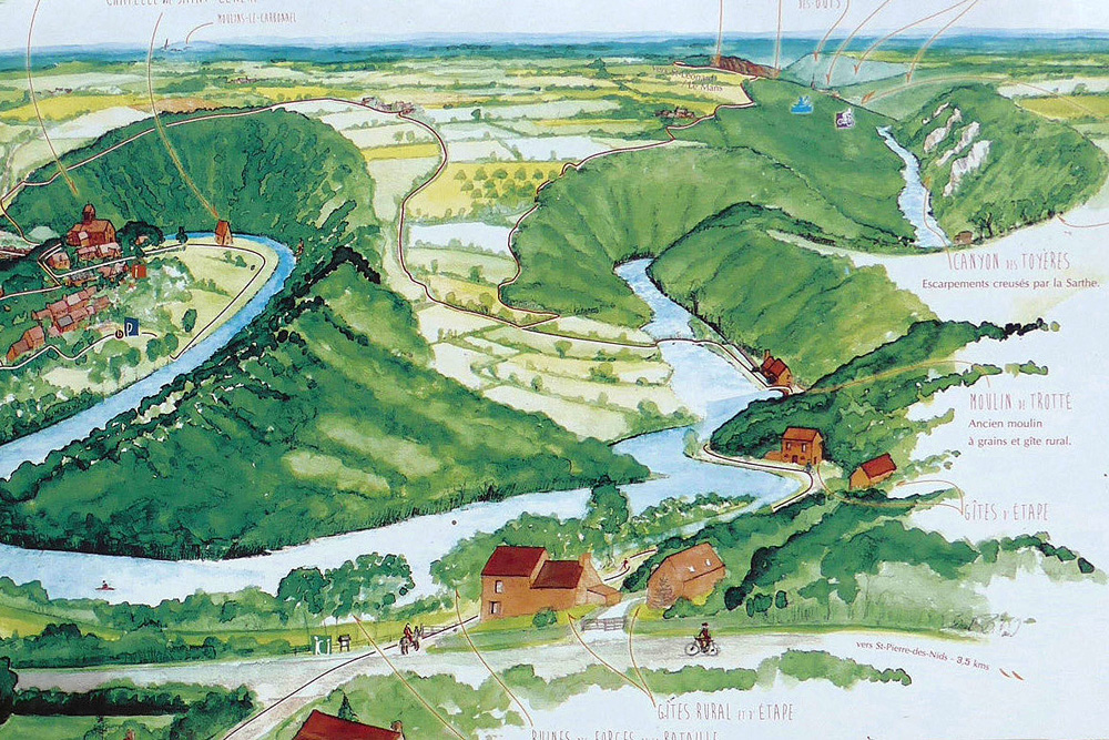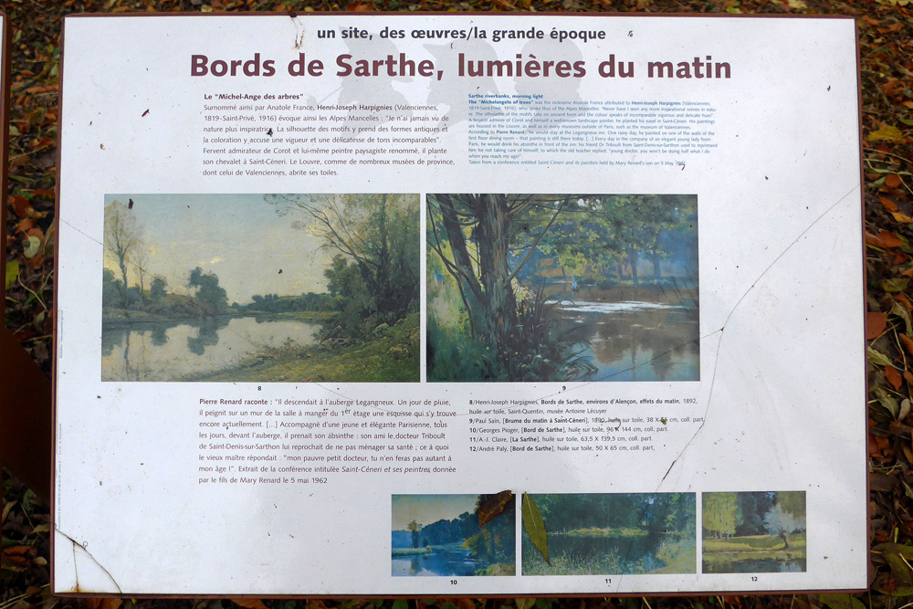Les bords de Sarthe ont attiré de nombreux peintres paysagistes entre 1875 et 1925 dont Saint-Céneri garde la mémoire. Des panneaux présentent quelques-unes de leurs œuvres le long d’un parcours découverte. La variété et le pittoresque des paysages peints sont liés à l’histoire géologique de la région. |
