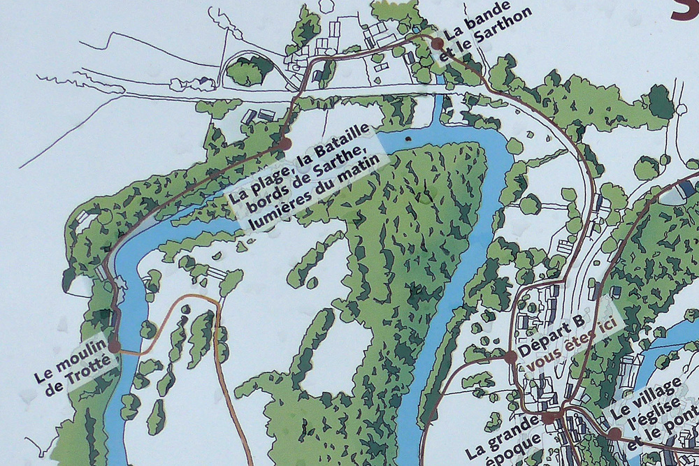 En face du moulin, la rive basse est occupée par les alluvions récentes de la Sarthe. |