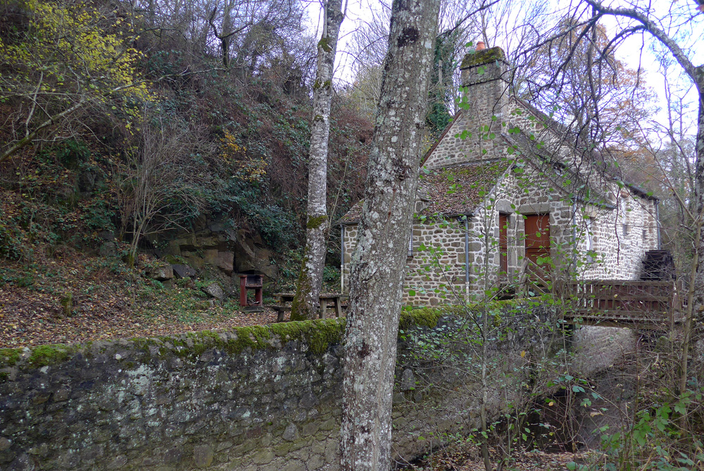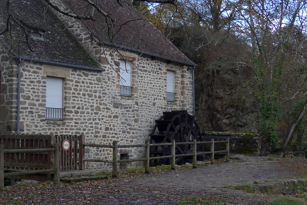 Cet ancien moulin à grains, transformé en gîte rural, a été construit au pied de la rive escarpée de la Sarthe creusée dans la granodiorite.