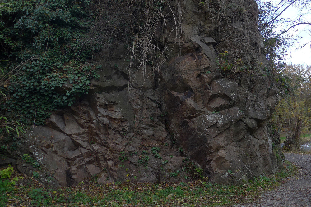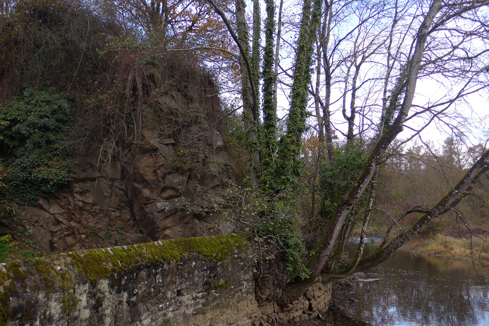 La granodiorite affleure dans la rive escarpée près du moulin |