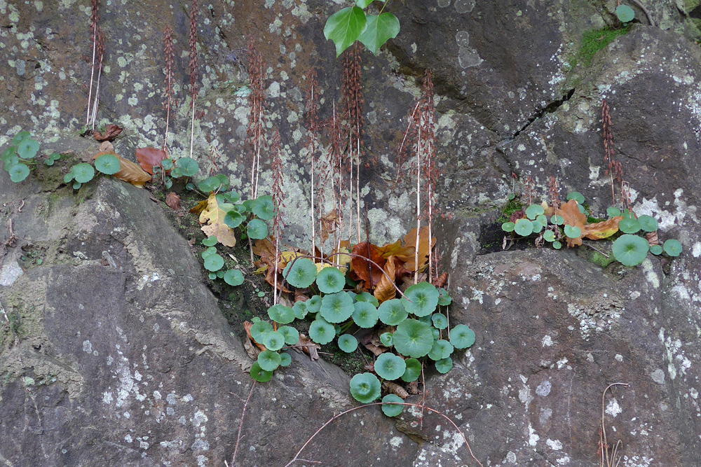 Les anfractuosités du rocher granitique sont colonisées par une plante silicicole, le « nombril de Vénus » (Umbilicus pendulatus). |