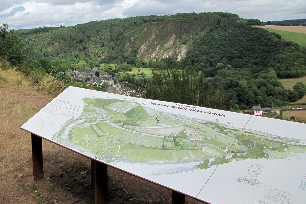La table de lecture du belvédère de la butte de Narbonne invite à la lecture du paysage offert par le méandre de la Sarthe à Saint-Léonard-des-Bois ; elle présente le lien entre la végétation et la nature du substratum sur le versant escarpé du Haut-Fourché. Cliché de Yannick Fromentin – été 2013