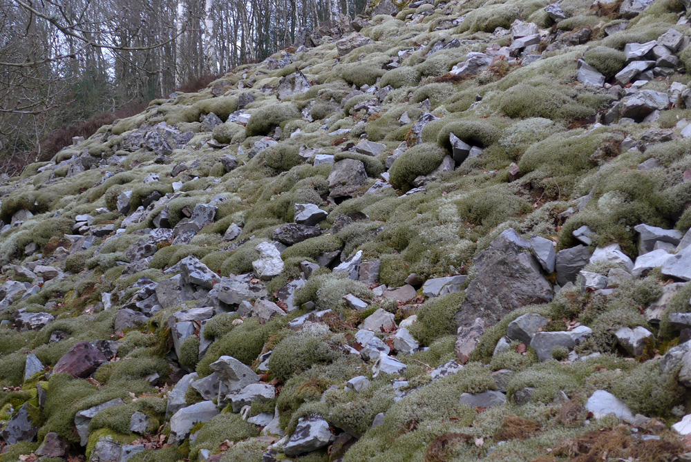 Des coussins de lichens (cladonies) et de mousses colonisent les blocs de grès armoricain du pierrier du Grand-Pâtis. |