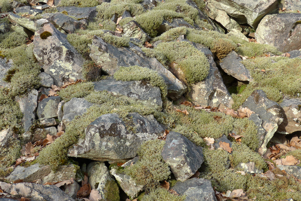 Lichens et mousses sur le pierrier de Grès de May au flanc sud du Rocher du Sphinx |