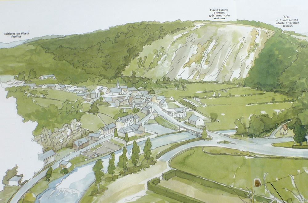 Au début du XXe siècle, le Grès armoricain presque dépourvu de végétation contrastait nettement avec les schistes briovériens couverts de bois. Depuis, le bois n’étant plus exploité comme source d’énergie et la tendance étant à la reforestation, des résineux envahissent le versant et masquent progressivement les affleurements rocheux. |