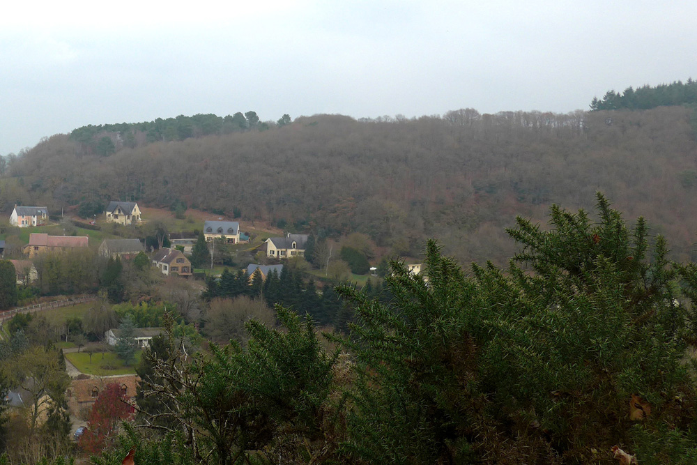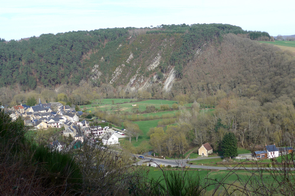 Le contraste entre les feuillus, arbres à feuillage caduc, et les résineux, arbres à feuillage persistant, est plus net en hiver (ou en automne). Dans la partie centrale du versant, le Grès armoricain présente des barres rocheuses et des éboulis progressivement colonisés par des résineux (pins) ; dans la partie sud du versant (à droite), les schistes briovériens sont recouverts de feuillus (chênes), dépourvus de feuilles en hiver. |