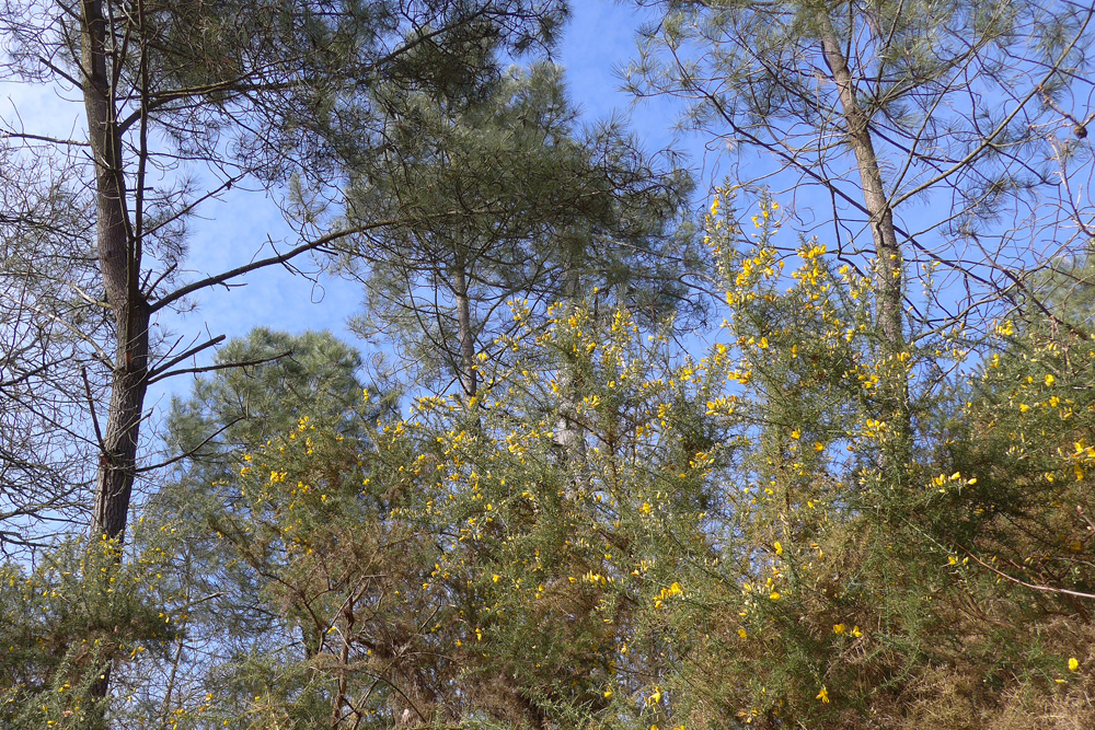 Pins et ajoncs (à fleurs jaunes) sont des éléments majeurs de la flore silicicole qui colonise le Grès armoricain (butte de Narbonne – St-Léonard). |