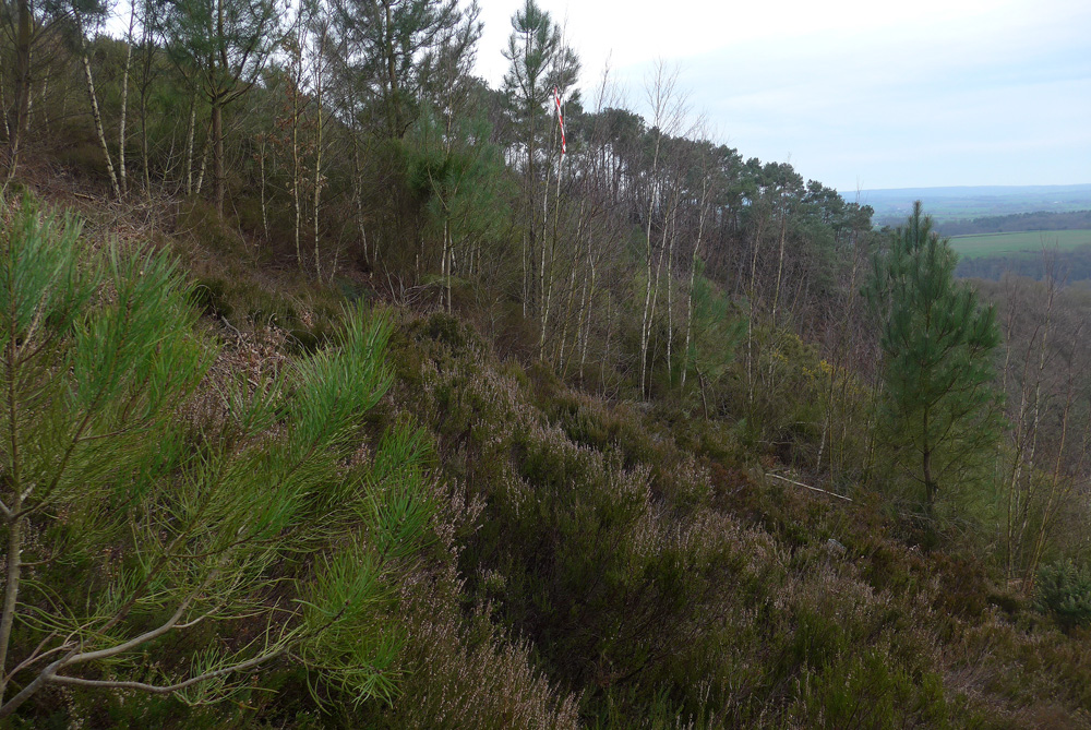 Au sommet du versant du Haut-Fourché, une trouée dans les pins laisse la place à une lande à bruyères, caractéristique des milieux siliceux. Au-delà, dans le couvert boisé, des bouleaux se mêlent aux pins. |