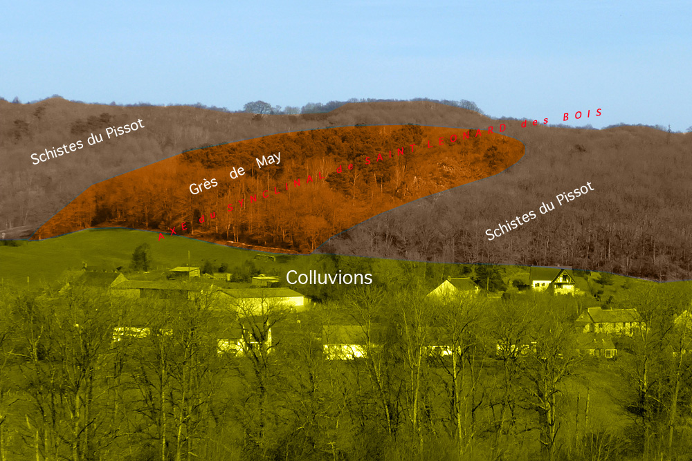 La terminaison périclinale des grès de May se dessine dans le paysage. Situés dans l’axe du synclinal, les Grès de May colonisés par les pins sont encadrés par les Schistes du Pissot couverts de feuillus. Au pied du relief, les prairies et les maisons s’étendent sur des colluvions.