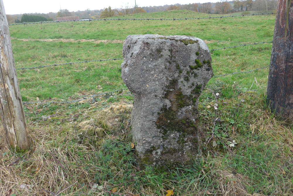 Borne en grès roussard plantée directement dans les Sables du Maine (Cénomanien) au carrefour de la route D101 et du chemin de la Berrerie, au Nord-Est de Saint-Céneri-le-Gérei