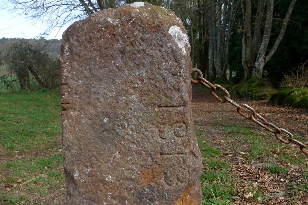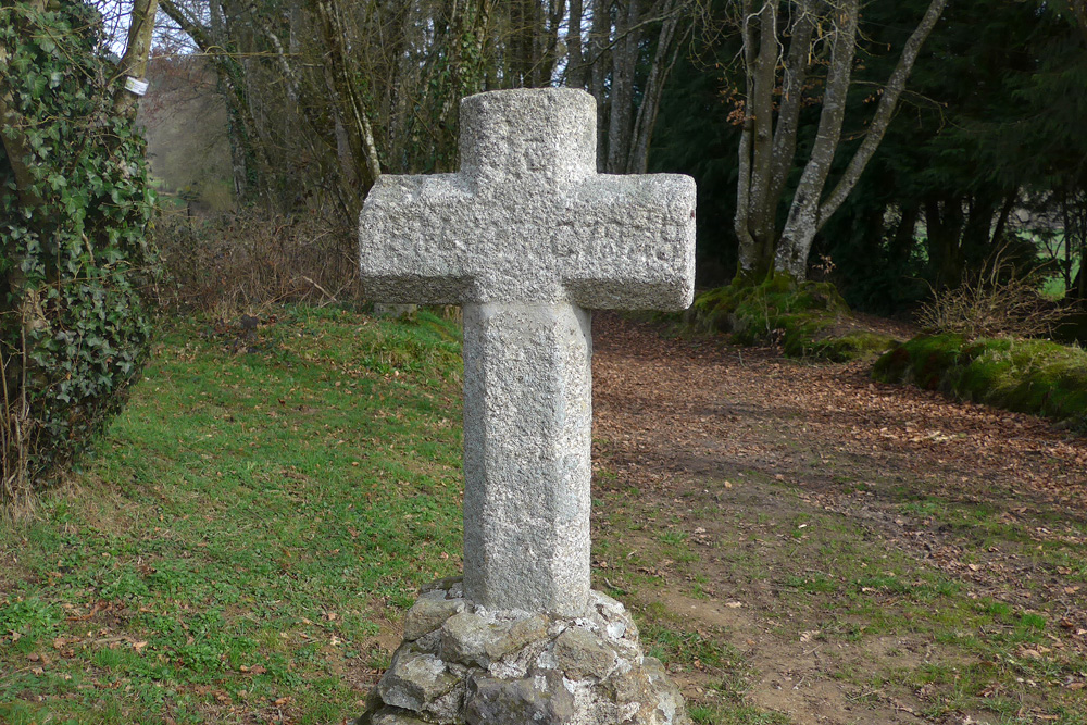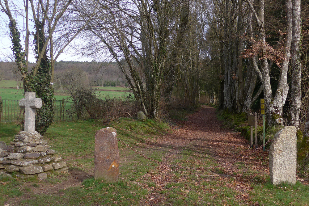 A Sainte-Anne-de-Champfrémont, une croix latine et deux bornes, l’une en grès roussard, l’autre en granite d’Alençon, marquent le départ du chemin de randonnée vers la forêt de Multonne et le mont des Avaloirs. |