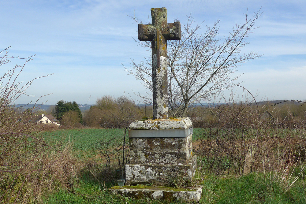 Croix en granite d’Alençon, montée sur un socle constitué de blocs de grès roussard. |