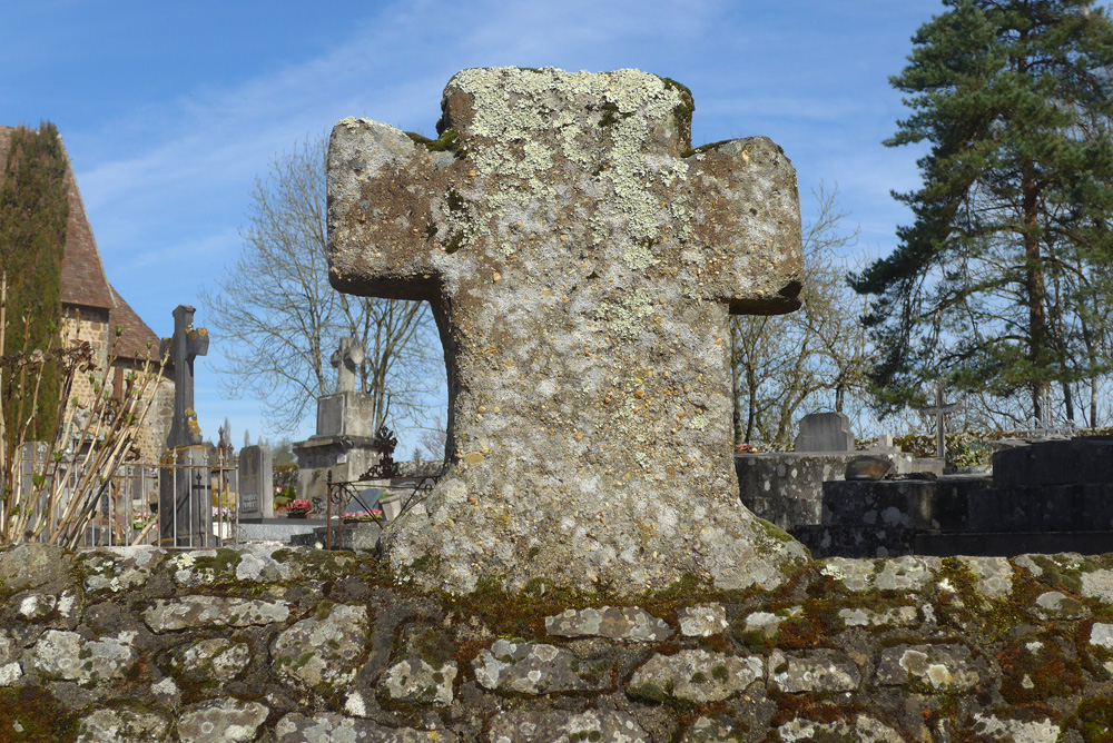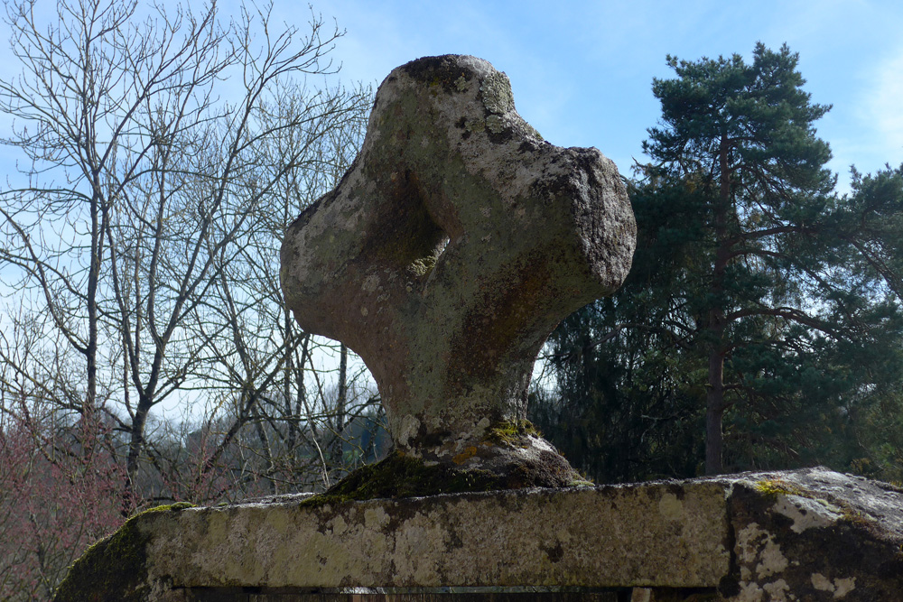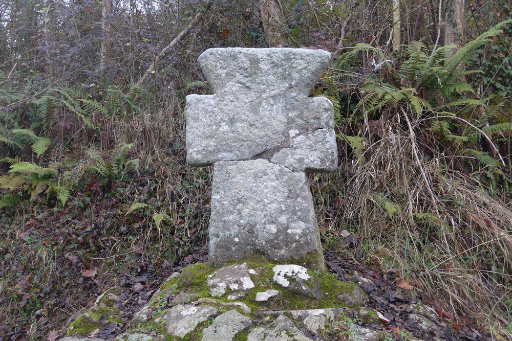 Croix archaïque en grès roussard surmontant la porte située dans l’angle nord-est du cimetière de St-Céneri |