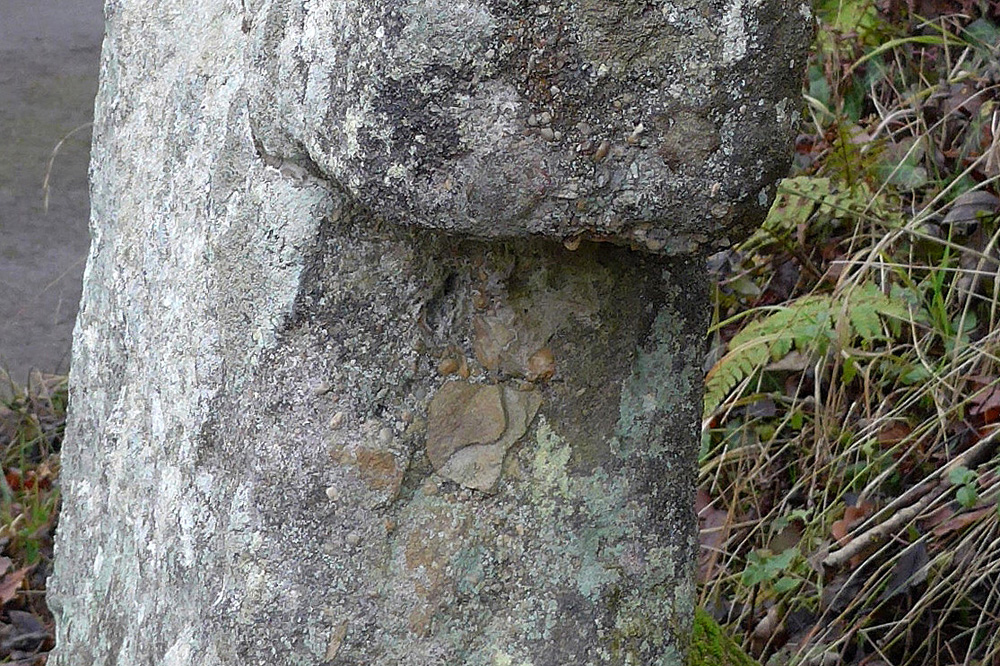 La présence de graviers et de galets permettent d’identifier le grès roussard sous les encroûtements de lichens gris. |