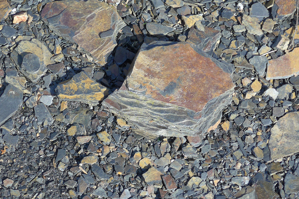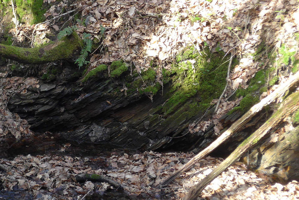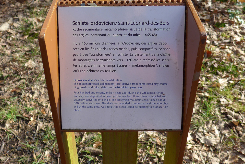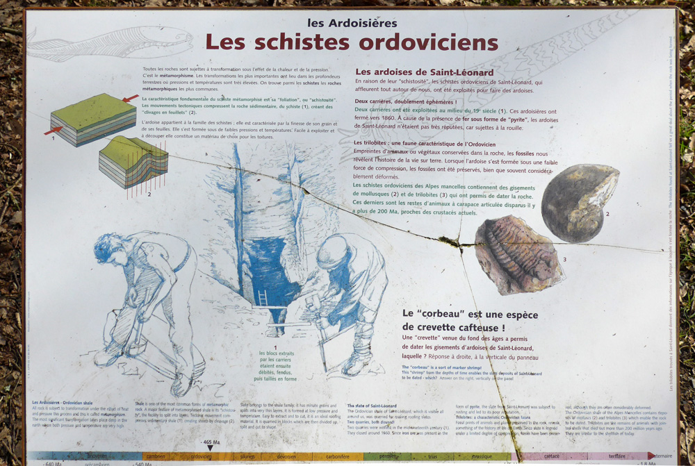 La roche se débite en feuillets sombres. Ce schiste ardoisier est issu de la compression d’argiles, roches sédimentaires à grain très fin, lors du plissement de la chaîne de montagne varisque. |