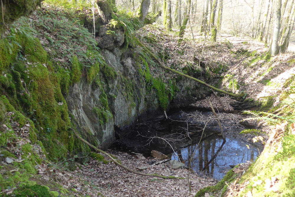 Ancien trou d’extraction creusé dans les Schistes du Pissot, localisé en bordure nord du chemin qui contourne la butte 193m. Il est séparé du chemin par un haut talus. A gauche, le front de taille présente des plans de schistosité subverticaux.