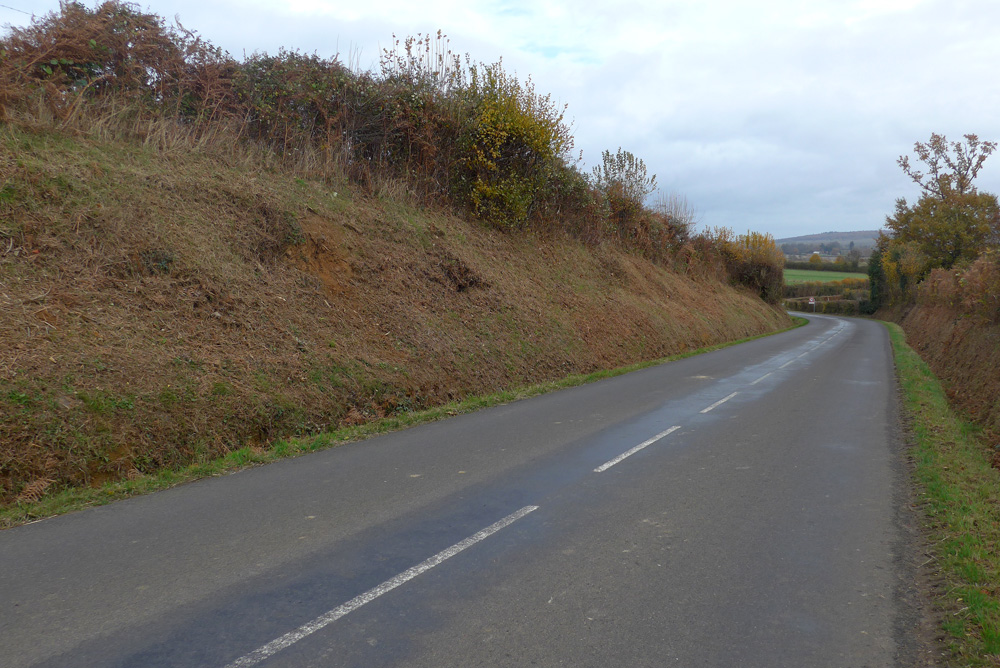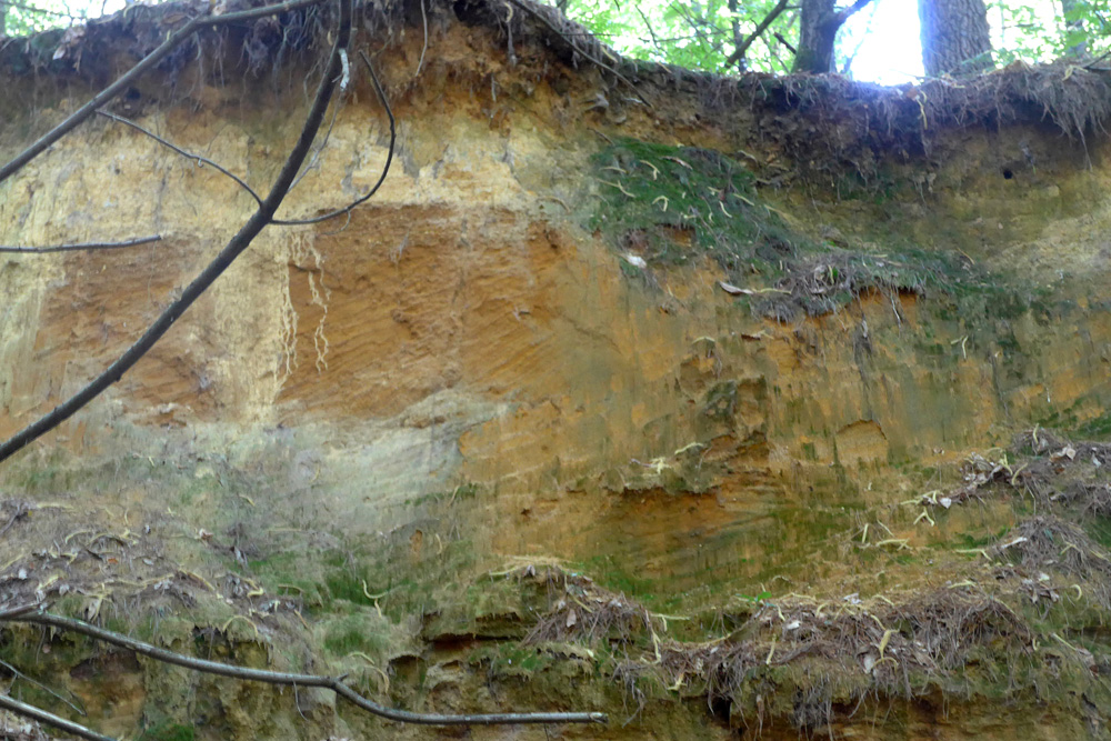 Les Sables du Maine affleurent dans la tranchée de la route D 101, après le point côté 170 à l’intersection avec les routes de la Porcherie et de la Garenne.