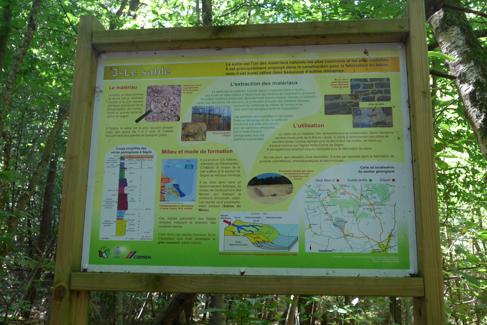 Ce front de taille a été préservé dans une ancienne carrière d’extraction de sable à Ségrie, localité située à une vingtaine de kilomètres au Sud de Saint-Céneri |