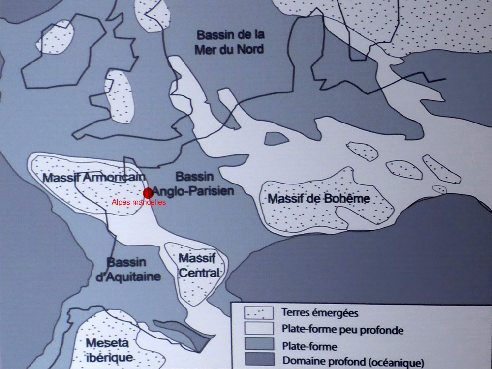 Les Alpes mancelles se situent sur la bordure du Massif armoricain (partie gauche de la figure). Le Cénomanien moyen y est représenté par la formation des Sables du Maine.