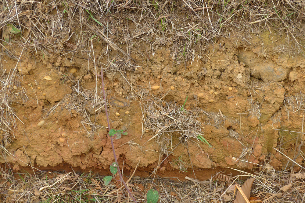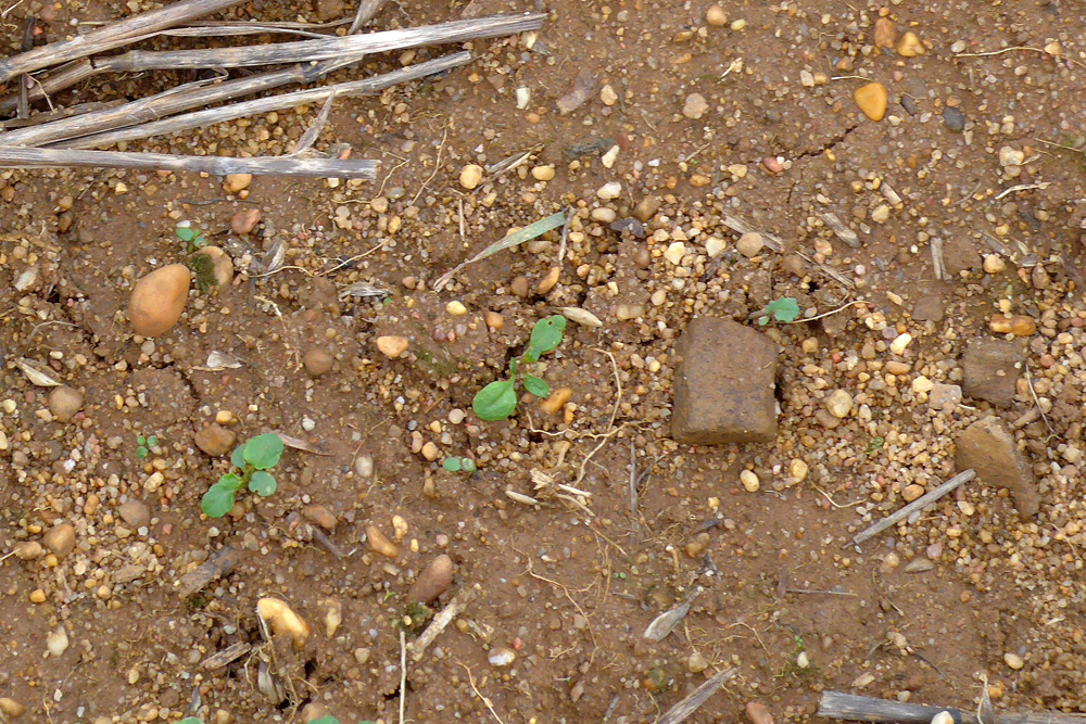 Le labourage a ramené à la surface des graviers ainsi que des galets auxquels s’ajoutent des petits blocs de grès roussard.
