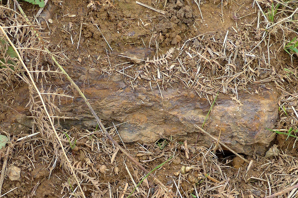 Le grès roussard, d'origine diagénétique, ne forme pas de bancs continus ; il est présent sous forme de dalles ou de gros blocs noyés dans les sables du sommet de la formation des Sables du Maine. |