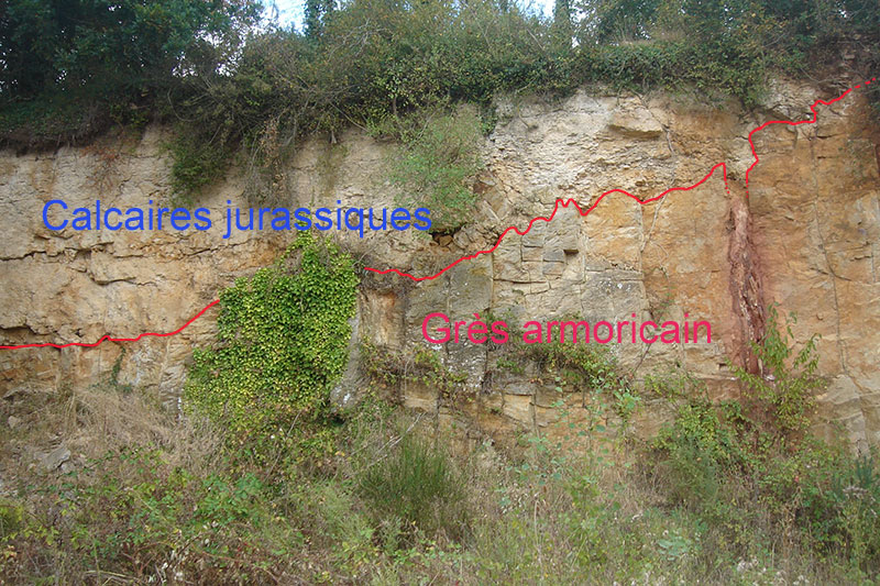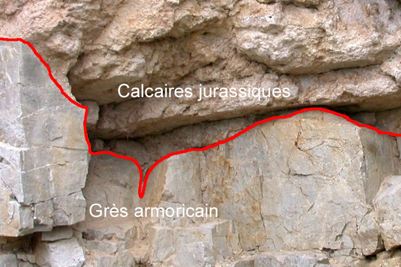 Les calcaires jurassiques comblent les anfractuosités crées par l’érosion des bancs de Grès armoricain subverticaux. La surface post-varisque présente des courbes adoucies qui témoignent d’une érosion chimique, par dissolution.