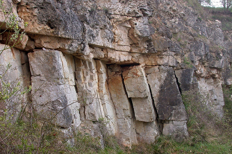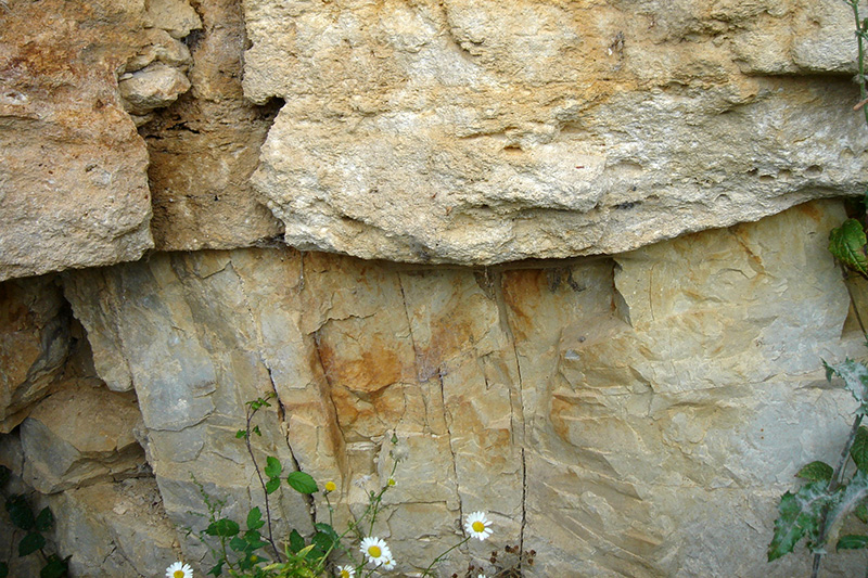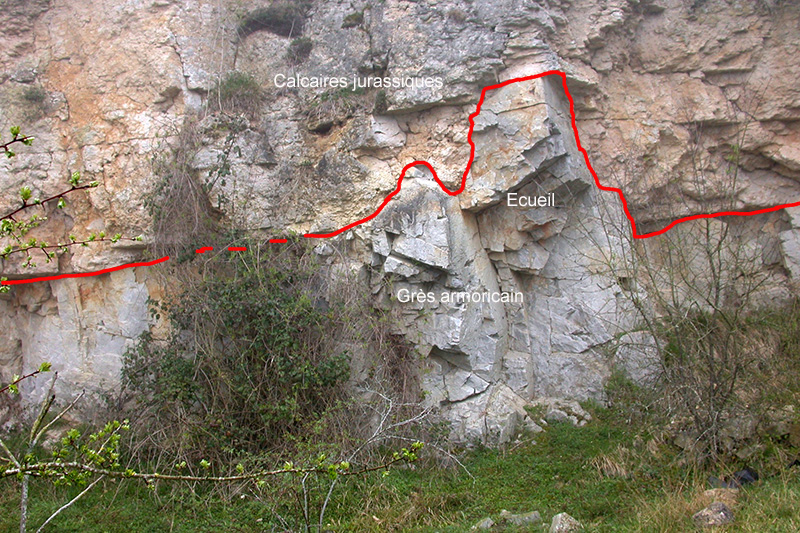 Les calcaires du Faciès de bordure des écueils (Jurassique – Bathonien), subhorizontaux, reposent sur le Grès armoricain (Ordovicien) redressé à la verticale. La surface de discordance correspond à la surface d’érosion post-varisque qui résulte de l’aplanissement de la chaîne varisque.